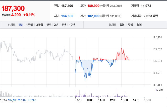 현재 솔브레인의 주가는 187,100원으로, 전일 대비 700원이 하락한 상태입니다. 주주 현황을 보면 정지완 씨를 포함한 8명이 총 44.92%의 지분을 보유하고 있습니다. 솔브레인은 반도체 및 관련 장비를 전문으로 하는 기업으로, 현재 장중 주가는 187,100원입니다. 회사의 시가 총액은 1조 4,554억 원이며, 총 발행 주식 수는 7,778,566주입니다. 외국인 투자자의 보유 비율은 33.65%이며, 장중 거래량은 20,486주에 달했습니다. 솔브레인의 매출액은 4,270억 원입니다.