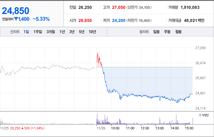 현재 실리콘투의 주가는 26,250원으로, 전일 대비 26.98원 하락했습니다. 주주 현황을 살펴보면 김성운 씨와 다른 6명이 총 41.95%의 지분을 보유하고 있습니다. 실리콘투는 온라인 쇼핑 기업으로, 현재 주가는 26,250원입니다. 이 회사의 시가총액은 1조 5,127억 원이며, 총 발행 주식 수는 60,873,234주입니다. 외국인 보유 비중은 9.48%이며, 장중 거래량은 818,339주를 기록했습니다. 매출액은 3,313억 원에 달합니다.