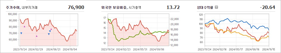 현재 에스엠의 주가는 76,900원으로, 전일 대비 5.06원 하락했습니다. 주주 현황을 보면 카카오와 그 외 12명이 총 41.02%의 지분을 보유하고 있습니다. 에스엠은 미디어 기업으로, 현재 주가는 76,900원입니다. 시가 총액은 1조 8146억 원이며, 발행 주식 수는 23,353,627주입니다. 외국인 보유 비중은 13.72%이며, 장중 거래량은 189,203주에 달했습니다. 에스엠의 매출액은 4,739억 원에 이릅니다.